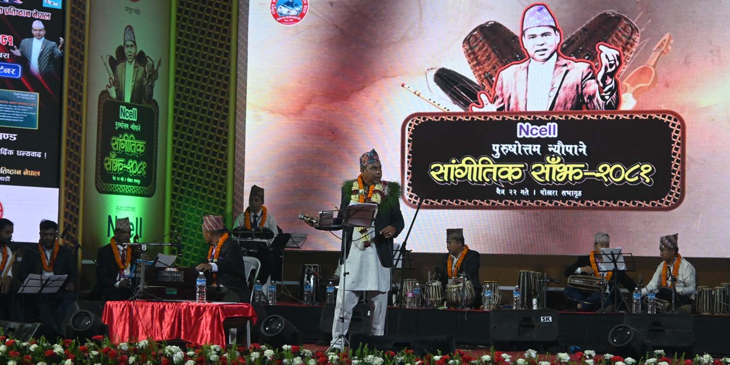 सांगीतिक साँझमा न्यौपानेले सररर पानीघट्टामा, ऐना हेरेर, रुन्छनी मन किन रुँदैनसहितका १८ गीत गाए ।