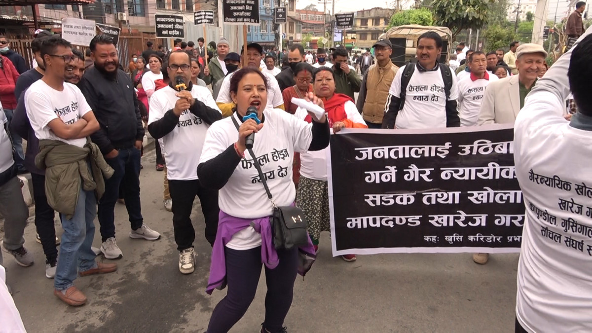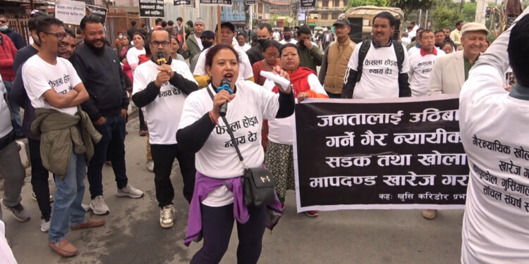 बिहीवार काठमाडौंको माईतीघर मण्डलामा भूमि अधिकार संरक्षण समितिको आह्वानमा उपस्थित भइ बिरोध प्रदर्श गरिएको हो । उनीहरुले जनतालाई उठिवास गर्ने गैरन्यायिक सडक तथा खोला मापदण्ड खारेज गर, झीगु भूमि झीगु अधिकार, जनताको सम्पतीको हक कायम गर, आइएसओ १६९ लागू गर जस्ता प्लेकार्ड र नारा लगाइ बिरोध प्रदर्शन गरेका हुन् । बिरोध कार्यक्रममा बोल्दै धोबिखोला करिडोर प्रभावित मुल समितिका अध्यक्ष ऋषिराम बस्यालले नदी किनारको २० मिटर क्षेत्र छोड्नुपर्ने फैसला सर्वोच्च अदालतले मनगढन्ते रुपमा गरेको आरोप लगाउनु भयो ।