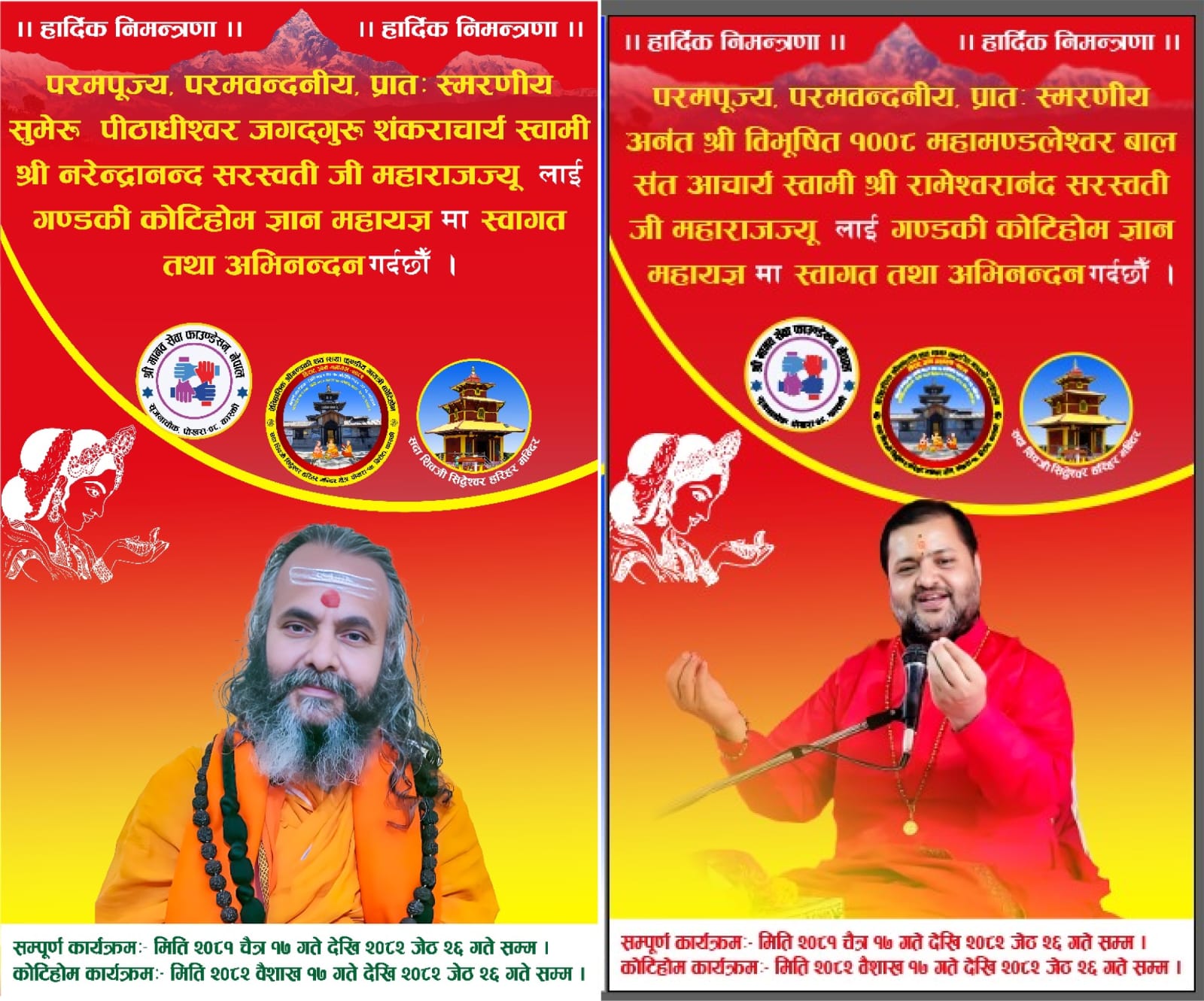 कोटिहोममा भोलि सुमेरु पीठाधीश्वर जगद्गुरु शङ्कराचार्य स्वामी श्री नरेन्द्रानन्द सरस्वती जी महाराज र अनन्त श्री विभूषित १००८ महामण्डलेश्वर वाल सन्त आचार्य स्वामी रामेश्वरानंद सरस्वती जी महारज आउने प्रचार प्रसार संयोजक लेखराज ढकालले जानकारी दिए।