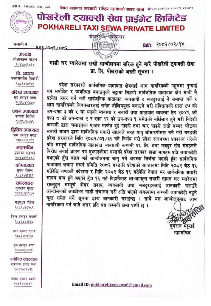 पोखरा । पोखरेली ट्याक्सी सेवा प्रालिले आआफ्ना सवारी साधन घर तथा ग्यारेजमा थन्क्याएर आन्दोलनमा सहभागी हुन आह्वान गरेको छ । संस्थाका महासचिव युवराज भट्टराईले एक सूचना जारी गर्र्दै यस्तो आग्रह गरेको हो ।