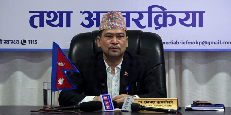 उहाँले ‘स्वास्थ्य बीमा ऐन, २०७४ को दोस्रो संशोधनको दफा ९ को उपदफा ६ तथा नियमावली २०७५ को प्रथम संशोधनको नियम २ को खण्ड ६ ले प्रथम सेवाबिन्दु सरकारी स्वास्थ्य संस्थामा मात्र रहने व्यवस्था गरेकाले विगतमा प्रथम सेवाबिन्दुको रुपमा विमितहरुलाई सेवा दिँदै आएका सरकारी बाहेकका अन्य सेवा प्रदायक स्वास्थ्य संस्थाबाट प्रथम सेवा बिन्दु हटाउने निर्णय भएको बताउनु भयो । प्रवक्ता बुढाथोकीकाअनुसार डेंगी संक्रमण हुँदा उच्च ज्वरो आउने, जोर्नी र मांशपेसीहरु बेस्सरी दुख्ने, आँखाको गेडी दुख्नु, टाउको धेरै दुख्नु, शरीरमा राता बिमिराहरु आउनु, वाकवाकी लाग्नु वा वान्ता हुनु जस्ता लक्षणहरु देखिन्छन् । डेंगी संक्रमित करिव ८० प्रतिशत केसहरुमा लक्षण नदेखिने बताउनु भयो ।