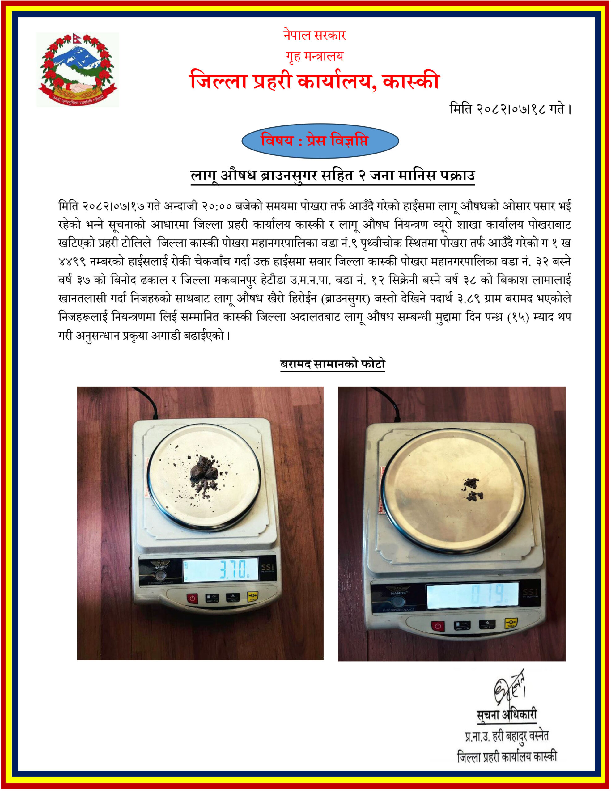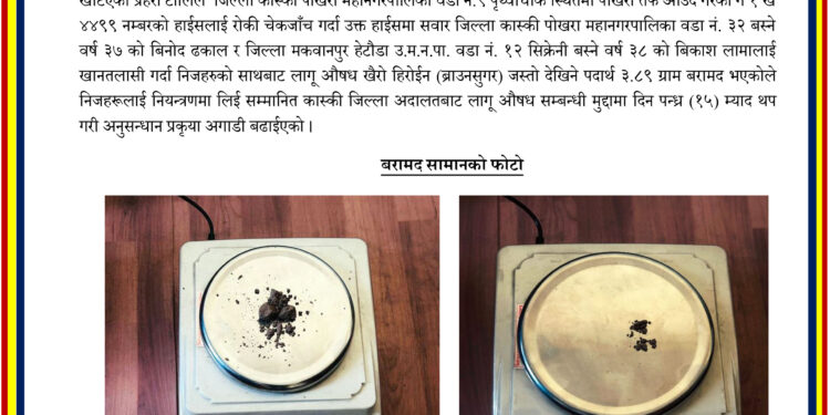 पोखरा, कास्की । जिल्ला प्रहरी कार्यालय कास्कीले लागू औषध ब्राउनसुगरसहित दुई जनालाई पक्राउ गरेको छ।
