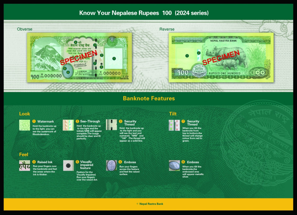 नेपाल राष्ट्र बैंक लिमिटेडले एक सय रुपैयाँको नयाँ नोट आज (मंसिर ११ गते) बाट प्रचलनमा ल्याएको छ । निःवर्तमान गभर्नर महाप्रसाद अधिकारीले हस्ताक्षर गर्नुभएको नयाँ नोट राष्ट्र बैंकले ल्याएको हो । उक्त नोट सङ्केत नं. २० क ०००००१ देखि ४० घ ९९९९९९ सम्म रहेको राष्ट्र बैंकले जनाएको छ । ‘नेपाल सरकारको जमानत प्राप्त यसको रुपैयाँ भुक्तानी माग्न आएमा नेपाल राष्ट्र बैंकबाट रुपैयाँ १०० रुपैयाँ एक सय तुरुन्त पाइने छ ।भन्ने लेखिएको छ ।