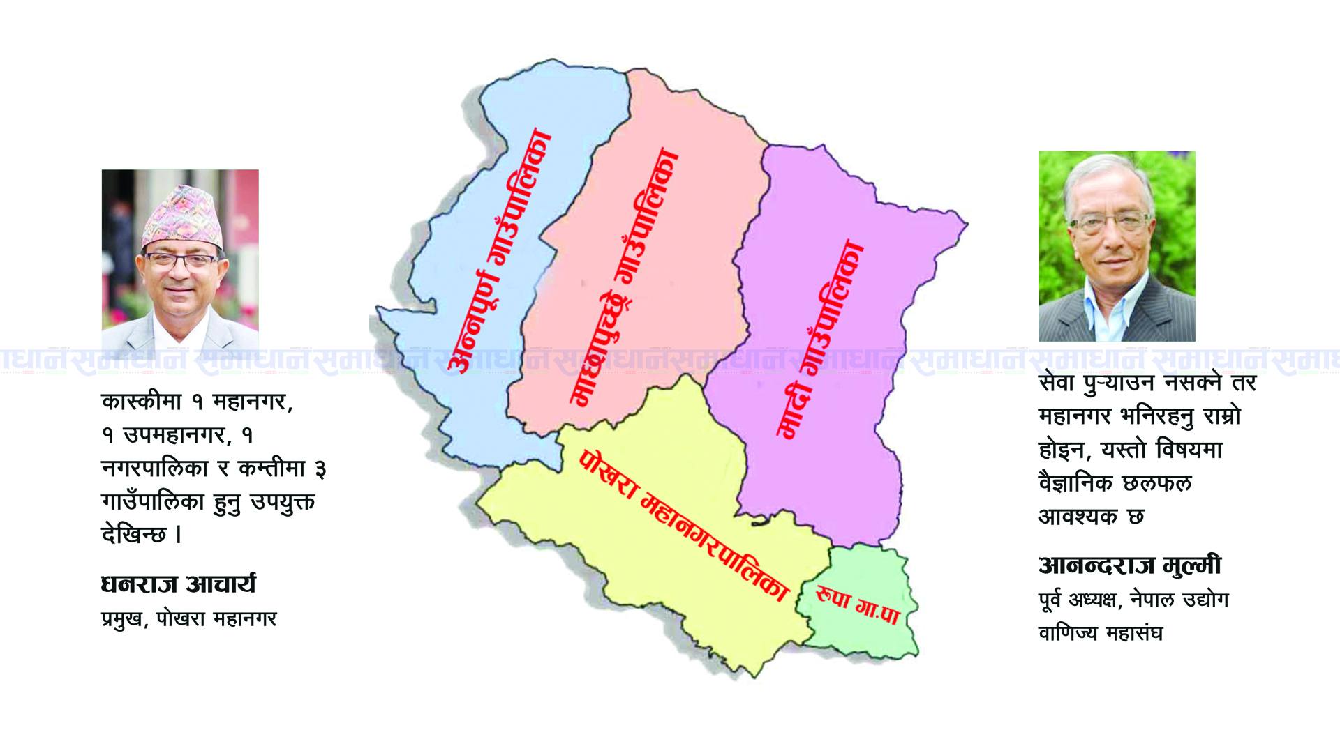 पुनर्संरचना गर्दा हतार नगर्न मुल्मीले सुझाव दिए । जनताको रायका आधारमा अघि बढ्नुपर्ने उनले बताए । ‘सेवा पु¥याउन नसक्ने तर महानगर भनिरहनु राम्रो होइन, उनले भने, ‘यस्तो विषयमा वैज्ञानिक छलफल आवश्यक छ । स्थानीय र प्रदेशको निर्वाचन नजिकिँदै गर्दा सरकारले यसमा चाँडो सुझाव मागेको उनले बताए । पृथ्वीनारायण क्याम्पसको भूगोल विभाग प्रमुख सहप्राडा रामजीप्रसाद पोखरेल पनि संरचना सुधारमा ध्यान दिनुपर्ने बताउँछन् । २०७३ सालको संरचनामा केही कमजोरी रहेको उनको तर्क छ । पुनर्संरचना गर्दा जनसंख्यालाई मात्रै आधार मान्न नहुने पोखरेलले बताए । ‘सहरी र ग्रामीण क्षेत्रको पेसा, सेवा केन्द्रको पहुँच र भौगोलिक बनावटलाई हेर्नुपर्छ, उनले भने, वडागत कार्यको गहनता र विकासको स्तरलाई पनि ध्यान दिनुपर्छ । कास्कीका ठूला भूगोल भएका पालिकामा सेवाग्राहीले सास्ती पाएको उनले बताए । पोखरा वरिपरिका पहाडी क्षेत्र र कृषिमा आधारित बस्तीलाई महानगरमा गाभ्दा सेवामा समानता नदेखिएको उनको भनाइ छ । उनले स्थानीय तहको संख्या बढाउन र साना वडालाई एकीकृत गर्न सुझाव दिए । ठूला भूगोल भएका वडालाई टुक्राएर सिमाना हेरफेर गर्नुपर्ने उनले बताए ।
