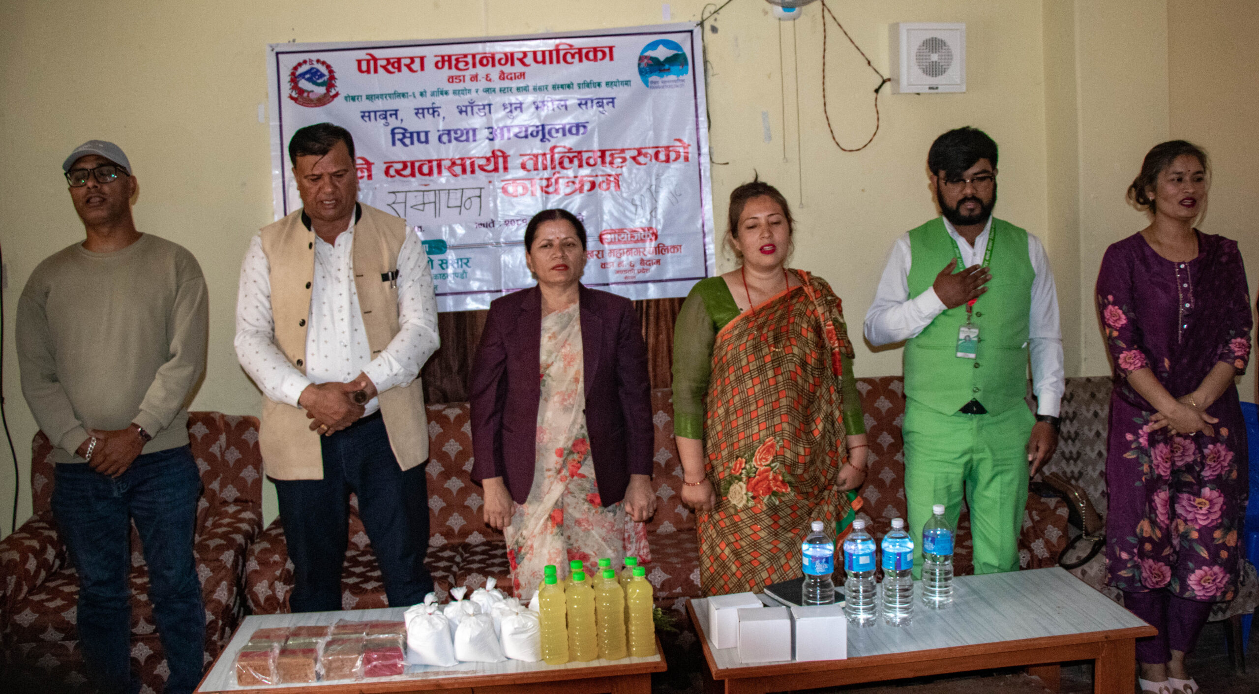 पोखरा महानगरपालिका वडा नं.-६ द्वारा आयोजित विपन्न महिलाहरूलाई आत्म निर्भर बनाउने उद्देश्यका साथ सञ्चालन गरिएको सीप तथा आयमूलक ५ दिने भाँडा धुने झोल साबुन, सरफ तथा साबुन बनाउने तालिम सम्पन्न गरेको छ ।