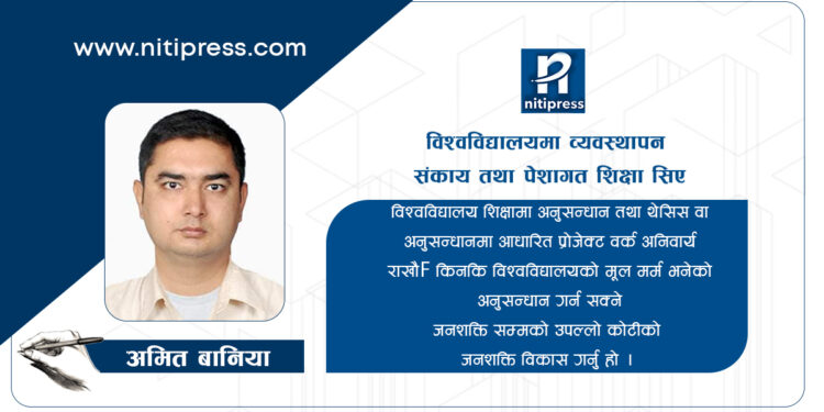 नेपालको विश्वविद्यालयका खासगरी त्रिभुवन विश्वविद्यालयमा स्नातक तथा स्नातकोत्तरका कार्यक्रमहरुलाई सेमेस्टर र ग्रेडिङ सिस्टममा लैजाऊ । यो गर्न ढिला भयो । स्नातक तहलाई ४ वर्षे र स्नातकोत्तर तहलाई २ वर्षे बनाऊ । खासगरी व्यवस्थापन संकायका विषयलाई अझ विशिष्टिकृत गरौ । व्यवस्थापन संकायका विधालाई स्नातक र स्नातकोत्तर तहमा नयाँ विद्या जस्तै Bachelor/Master  in Professional Accounting, Bachelor/ Master in Financial Management, Bachelor/Master in Economics, Bachelor in Banking, Bachelor in Insurance,  गरी विशिष्टिकृत गरौ । अर्कोमा स्नातक तहमा Bachelor in Banking and Insurance वा स्नातकोत्तर तहमा Master in Banking / Master in Insurance गरी छुट्टुाछुट्टै बनाऊ तर स्नातक तहमा २ विषयमा विशेषज्ञता एउटै कोर्षमा हुने गरी Banking and insurance को कोर्ष बनाऊ जुन अहिले पनि छ । खासगरी अधिकांश निजी विश्वविद्यालयका स्नातकोत्तर तह वा एमविएमा अर्थशास्त्र र लेखामा विशेषज्ञता राखिएको छैन, जुन व्यवस्थापनका प्रमुख विषय हुन् । त्यसैले ती मूल विषय पनि विषय विशेषज्ञतामा राखौँ । अहिले त व्यवस्थापन सूचना प्रणालीमा पनि वा डाटा म्यानेजमेन्टमा पनि विशेषता राखिन्छ जुन समयको माग पनि हो । यता एमबिसमा चाहिँ लेखा विषयमा पनि विशेषज्ञता छ तर अधिकांश विश्वविद्यालयका कोर्षमा यो राखिएको छैन । तर काठमाडौ विश्वविद्यालयले राख्न थालिसकेको छ जुन नेपालको अग्रणीमा आउने विश्वविद्यालय पनि हो । अब विश्वविद्यालयको सङ्ख्या धेरै बनाउने भन्दा पनि विशिष्टिकृत विश्वविद्यालय केही बनाऊ, कृषि तथा वन विश्वविद्यालय जसरी । अब बनाऊ इन्जिनियरिङ विश्वविद्यालय नेपाल, प्राविधिक विश्वविद्यालय नेपाल, कला विश्वविद्यालय नेपाल, व्यवस्थापन विश्वविद्यालय नेपाल, स्वास्थ्य विज्ञान विश्वविद्यालय नेपाल, शिक्षा संकाय विश्वविद्यालय नेपाल, विज्ञान विश्वविद्यालय नेपाल जुन विशिष्टिृत क्षेत्रको अध्ययन तथा अुनसन्धानका लागि विकास गरिने छ । अब साधारण धार तथा प्रकृतिका विश्वविद्यालयको सङ्ख्या पुग्यो । विश्वविद्यालय मात्र धेरै बनाउनुभन्दा अब गुणस्तरमा र जनशक्तिको विकास र अनुसन्धान कार्यमा ध्यान दिऊ । विश्वविद्यालय शिक्षामा अनुसन्धान तथा थेसिस वा अनुसन्धानमा आधारित प्रोजेक्ट वर्क अनिवार्य राखौँ किनकि विश्वविद्यालयको मूल मर्म भनेको अनुसन्धान गर्न सक्ने जनशक्ति सम्मको उपल्लो कोटीको जनशक्ति विकास गर्नु हो ।