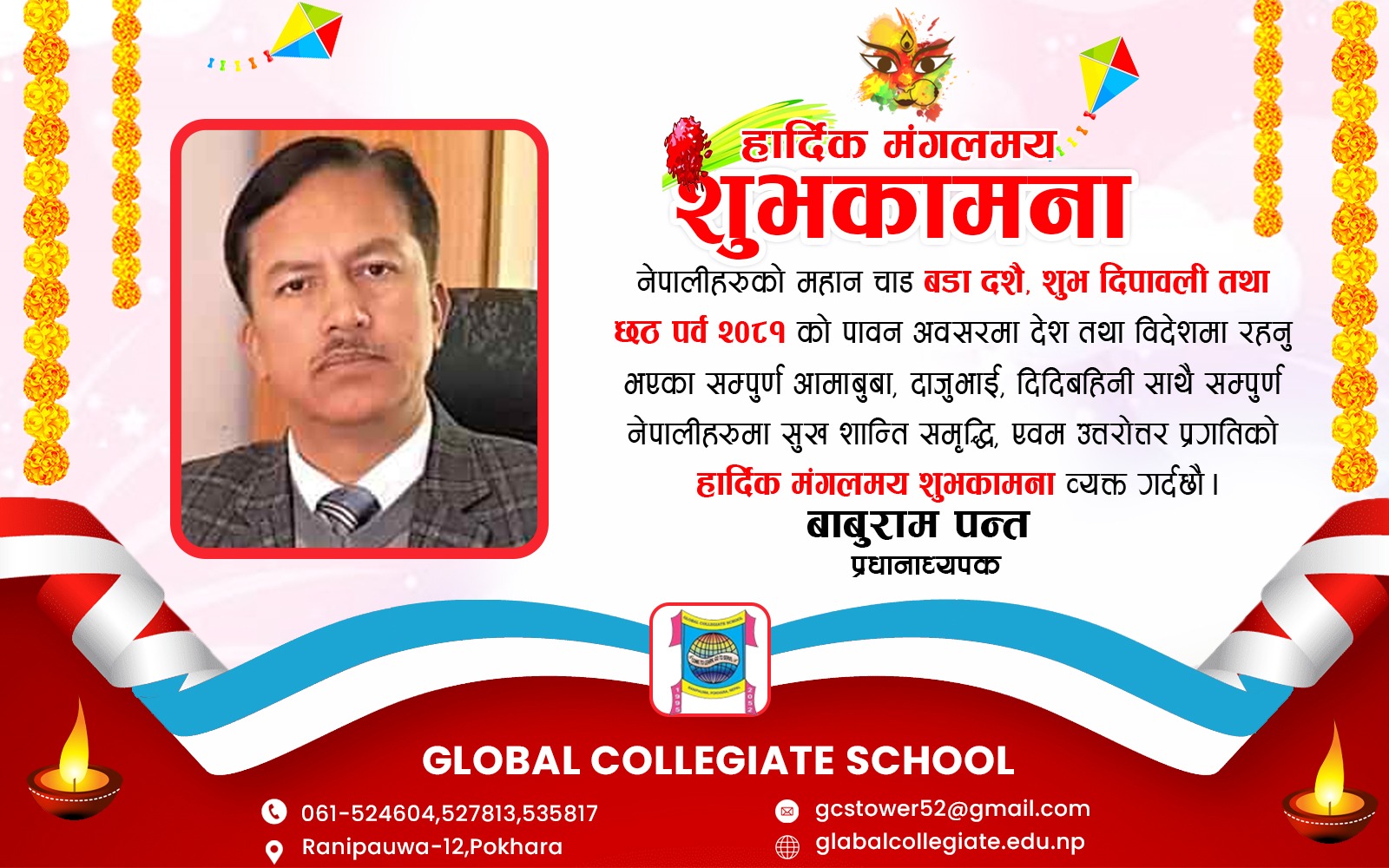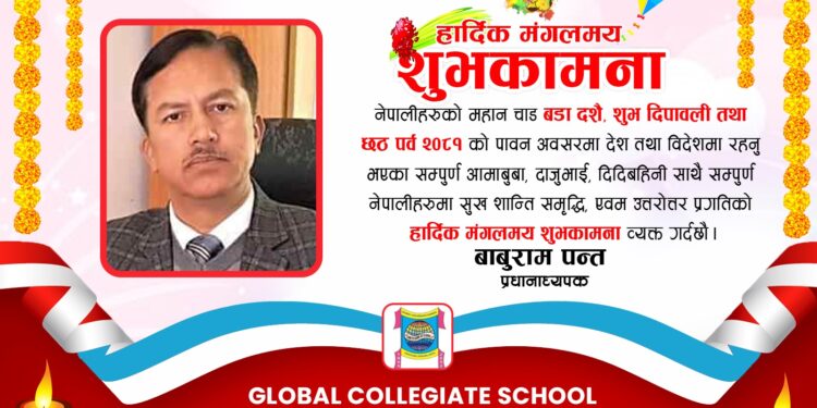 नेपालीहरुको महान चाड बडा दशै, शुभ दिपावली तथा छठ पर्व २०८१ को पावन अवसरमा देश तथा विदेशमा रहनु भएका सम्पुर्ण आमाबुबा, दाजुभाई, दिदिबहिनी साथै सम्पुर्ण नेपालीहरुमा सुख शान्ति समृद्धि, एवम उत्तरोत्तर प्रगतिको हार्दिक मंगलमय शुभकामना व्यक्त गर्दछौ ।