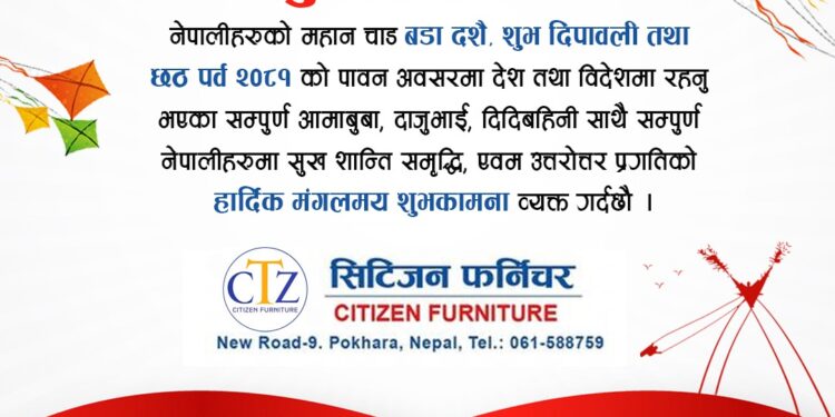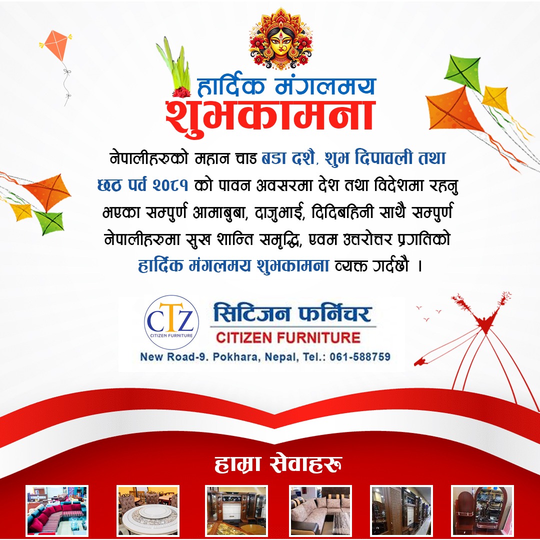 नेपालीहरुको महान चाड बडा दशै, शुभ दिपावली तथा छठ पर्व २०८१ को पावन अवसरमा देश तथा विदेशमा रहनु भएका सम्पुर्ण आमाबुबा, दाजुभाई, दिदिबहिनी साथै सम्पुर्ण नेपालीहरुमा सुख शान्ति समृद्धि, एवम उत्तरोत्तर प्रगतिको हार्दिक मंगलमय शुभकामना व्यक्त गर्दछौ ।