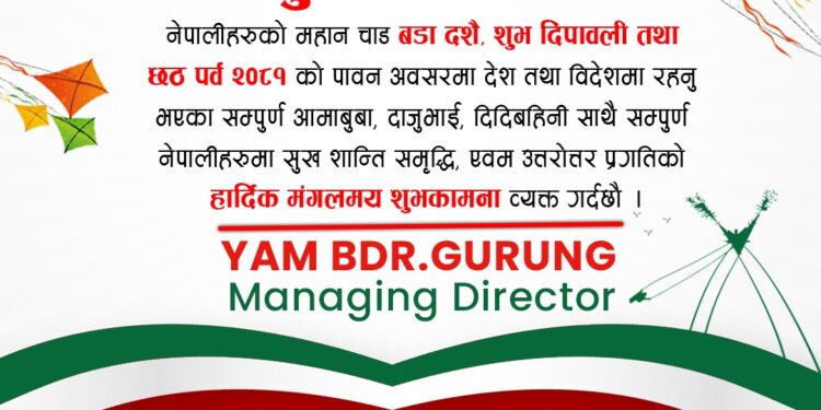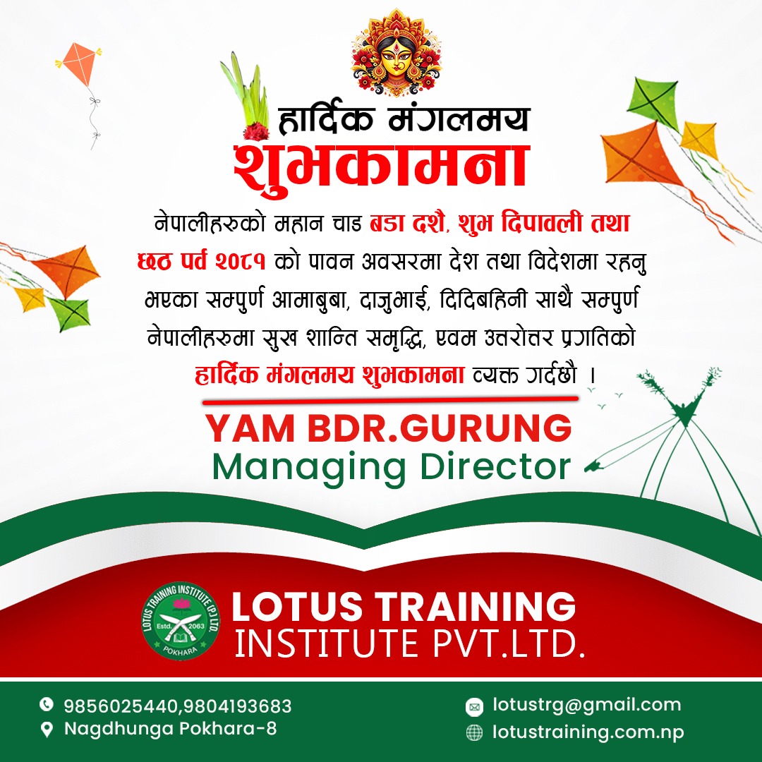 लोटस ट्रेनिङ इन्स्टिच्युट प्राइभेट लिमिटेडको एम बहादुर गुरुङ द्वारा बडा दशैंको शुभकामना