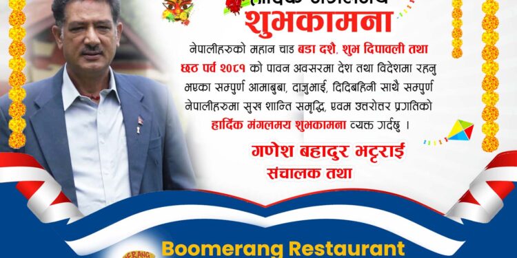 नेपालीहरुको महान चाड बडा दशै, शुभ दिपावली तथा छठ पर्व २०८१ को पावन अवसरमा देश तथा विदेशमा रहनु भएका सम्पुर्ण आमाबुबा, दाजुभाई, दिदिबहिनी साथै सम्पुर्ण नेपालीहरुमा सुख शान्ति समृद्धि, एवम उत्तरोत्तर प्रगतिको हार्दिक मंगलमय शुभकामना व्यक्त गर्दछौ ।