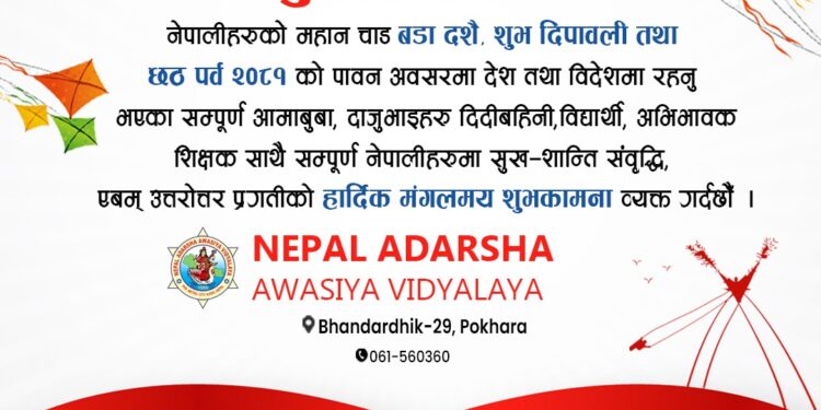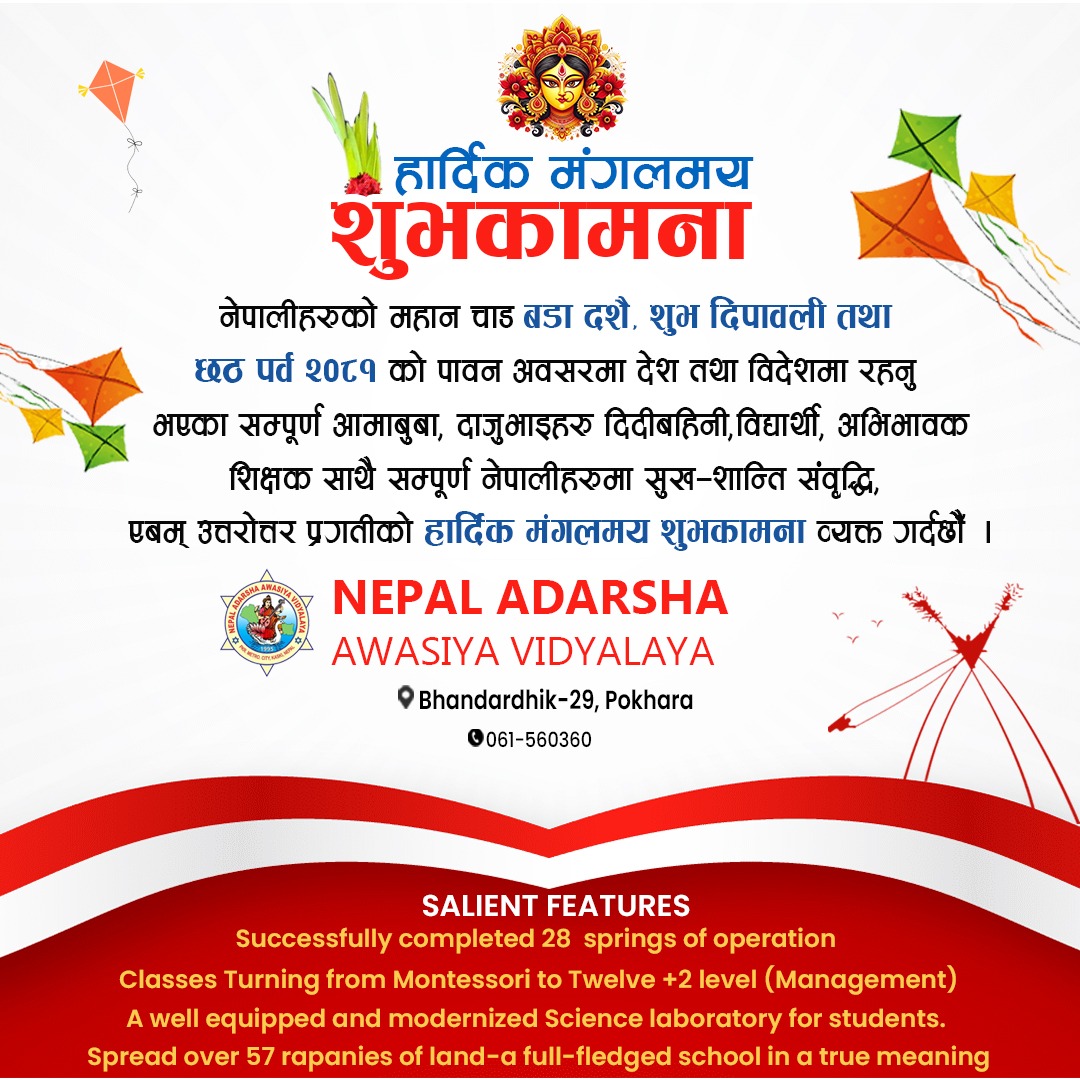 नेपालीहरुको महान चाड बडा दशै, शुभ दिपावली तथा छठ पर्व २०८१ को पावन अवसरमा देश तथा विदेशमा रहनु भएका सम्पुर्ण आमाबुबा, दाजुभाई, दिदिबहिनी साथै सम्पुर्ण नेपालीहरुमा सुख शान्ति समृद्धि, एवम उत्तरोत्तर प्रगतिको हार्दिक मंगलमय शुभकामना व्यक्त गर्दछौ ।
