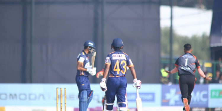 पहिले ब्याटिङ गरेको लुम्बिनीले २० ओभरमा ६ विकेट गुमाउँदै १६७ रन बनायो । खराब शुरूवात गरेको लुम्बिनीले मात्र १ रन जोड्दा दुई ओपनर गुमायो । दोस्रो ओभरमा रिजन ढकालले ओपनर आशुतोष घिरोहियालाई १ रनमा र उन्मुक्त चन्द ० रनमा पबिलियनको बाटो देखाइदिए । शुरूवातमा नै दुई विकेट गुमाएर दबाबामा परेको लुम्बिनीले पावर प्लेमा २ विकेटको नोक्शानीमा ३३ रन मात्र बनायो । यसपछि अर्जुन साउद १५ रनमा र टम मोर्स १० रनमा आउट भए । यतिखेर लुम्बिनीले चार विकेटको नोक्शानीमा ४९ रन जोडेको थियो । संघर्ष गरेको लुम्बिनीको लागि कप्तान रोहित पौडेलले सुझबुझपूर्ण ब्याटिङ गरे । रोहित र साद बिन जाफरले पाँचौं विकेटको लागि शतकीय साझेदारी गरे । उनीहरूले ११४ रनको साझेदारी गर्दा दुवैले अर्धशतकीय पारी खेले । रोहितले ४२ बलमा अर्धशतक पूरा गरे । उनले ५७ बलको सामना गर्दै ६ चौका र ५ छक्कासहित ८० रनको उत्कृष्ट पारी खेले । सादले ३५ बल खेलेर ४ चौका र १ छक्कासहित ५२ रन बनाए । बलिङमा रिजन ढकालले सर्वाधिक ३ विकेट लिए ।