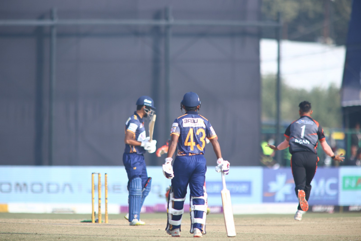 जितको लागि १६८ रनको लक्ष्य पछ्याएको चितवन २० ओभरमा ८ विकेट गुमाउँदै १३४ रनमा समेटियो । चितवन शुरूवातमा नै दबाबमा प¥यो । जब १६ रन मात्र बनाउँदा ३ विकेट गुमायो । विपिन रावल ५ रनमा आउट भए । यसपछि कप्तान रोहित पौडेलले सन्तोष कार्कीलाई १० रनमा र सोहेल तनवीरलाई १ रनमा पबिलियनको बाटो देखाइदिए । लुक बेन्केनस्टेन ३१ रनमा आउट भए । लगत्तै रोहितले रवि बोपरालाई विवेक यादवद्वारा क्याच आउट गरे । रोहितले यसपछि जान निकोललाई पनि मात्र ६ रनमा आउट गरे । यतिखेर चितवनले ६ विकेट गुमाउँदै ७९ रन मात्र बनाएको थियो । अमर राउटेला ६ रनमा र यसपछि कप्तान कुशल मल्ल पनि २० रनमा आउट भएसँगै चितवनको हार लगभग निश्चित भयो । यसपछि नर सार्कीले अविजित २२ र रिजन ढकालले अविजित १५ रन बनाएपनि चितवन १३४ रनमा समेटियो ।