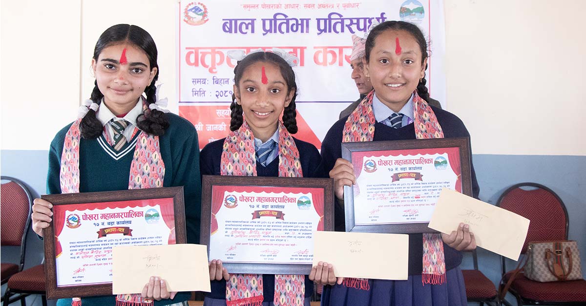 प्रतियोगितामा पहिलो पुरस्कार रु. १०,००० र प्रमाणपत्र कक्षा ८ की रासिका थापाले ( ढुंगे साहु बोर्डिङ स्कुल), दोस्रो पुरस्कार रु. ७,००० र प्रमाणपत्र कक्षा १० की एलिशा कुसालले (बालोदय बोर्डिङ स्कुल) , तेस्रो पुरस्कार रु. ५,००० र प्रमाणपत्र कक्षा ८ की अर्पिता भण्डारीले (ढुंगे साहु बोर्डिङ स्कुल) यसै सान्त्वना पुरस्कार रु. ३,००० र प्रमाणपत्र कक्षा १० की जेनिशा घलेले (पि.के.जि. स्कुल) ले प्रतियोगितमा हात पार्न सफल भएका थिए।