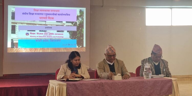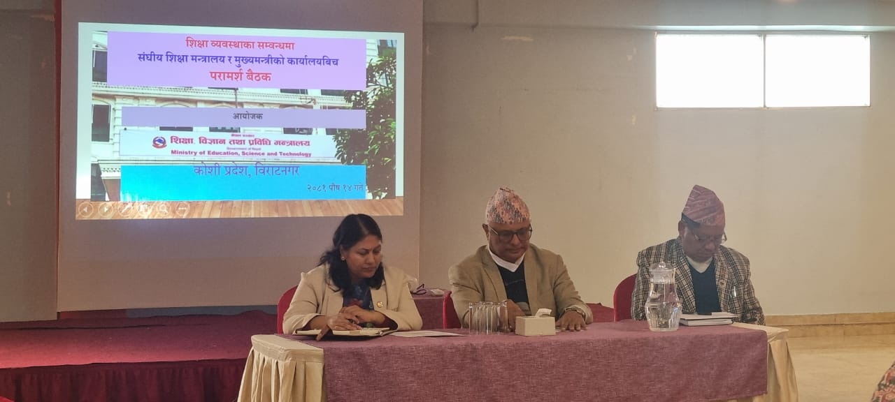विराटनगर, पौष १५ – शिक्षा प्रणालीमा सुधार ल्याउने उद्देश्यले संघीय शिक्षा, विज्ञान तथा प्रविधि मन्त्रालय र कोशी प्रदेश सरकारको संयुक्त आयोजनामा विराटनगरमा एक परामर्श बैठक सम्पन्न भएको छ। बैठकमा शिक्षा, विज्ञान तथा प्रविधि मन्त्री श्री विद्या भट्टराईले गुणस्तरीय शिक्षामा जोड दिँदै तीन तहका सरकारबीच समन्वय र सहकार्य आवश्यक रहेको बताउनु भयो । उहाँले भन्नुभयो, “संविधानले अधिकार तोकेको छ, संघियताका तीनओटै तहका विशिष्टिकृत अधिकार छन्, तर सँगसँगै मिलेर गर्न सकिने काम पनि छन्। अनिवार्य तथा निःशुल्क शिक्षा ऐन कार्यान्वयनका लागि तीन तहको सरकारबीच सहकार्य आवश्यक छ।” उहाँले युवाहरूलाई स्वदेशमै रोजगारीको अवसर सिर्जना गर्नुपर्ने र आधारभूत तहमा कोही पनि शिक्षाबाट वञ्चित हुन नहुने बताउनु भयो । कार्यक्रममा मन्त्री भट्टराईले शिक्षा विधेयक संसदमा विचाराधीन रहेको र यसबाट सकारात्मक परिणाम आउने आशा व्यक्त गरिन्। शिक्षाका हरेक काममा संघीय सरकार मात्र नभई प्रदेश र स्थानीय तहको पनि साझेदारी तथा योगदान हुनुपर्ने कुरामा उहाँले जोड दिँदै स्थानीय तहले आफ्नो बजेटबाट स्थानीय शिक्षा कोष खडा गर्नु पर्छ उल्लेख गर्नुभयो । उक्त कार्यक्रमबाट आएका निष्कर्ष शिक्षा प्रणालीको समग्र सुधारका लागि महत्वपूर्ण खुराक हुने कुरा बताउँदै बैठक सातै प्रदेशमा सञ्चालन गरिने र प्रदेशहरूबाट प्राप्त निचोडलाई संश्लेषण गरेर विषयगत समितिमा राखी आगामी दिनमा शिक्षाको नीति र बजेट तय गरिने बताउनु भयो ।